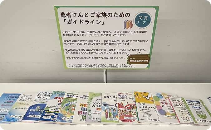 「患者さんとご家族のためのガイドライン」の閲覧コーナーをご用意します。病気や治療に関する正確で正しい情報をお読みいただくことができます。ガイドラインは、わかりやすい文章や図解で解説されています。是非お手に取ってご覧ください。※販売はございません。