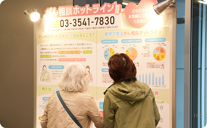 がんになると、治療や副作用のことだけではなく、お金や仕事のこと、人間関係のことなど、様々な不安や心配事が出てきます。日本対がん協会が運営する無料電話相談「がん相談ホットライン」に届く声を、パネル展示でご紹介します。