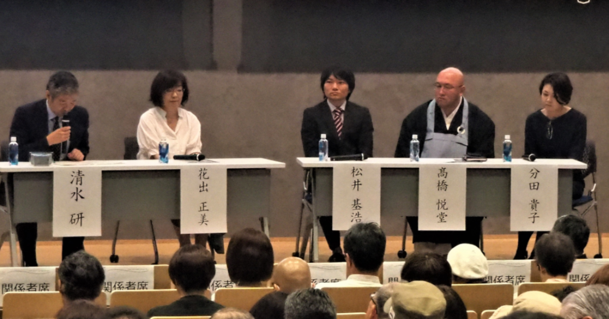 基調講演を行った清水研さんがファシリテーターになり、4人のパネリストを迎えた。 がん研究会有明病院がん相談支援センター看護師長の花出正美さん。東京都立小児総合医療センター血液・腫瘍科の松井基浩医師。宮城県栗原市の普門寺副住職の高橋悦堂さん。東京大学医学部附属病院がん相談支援センター副センター長の分田貴子医師。