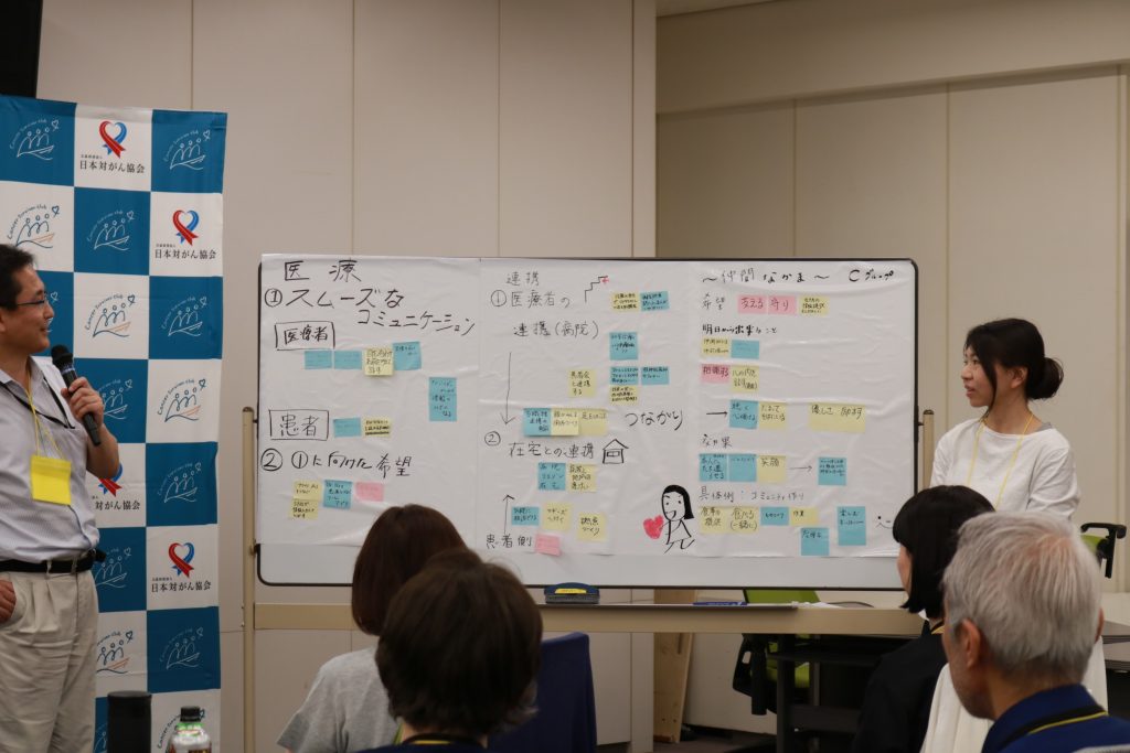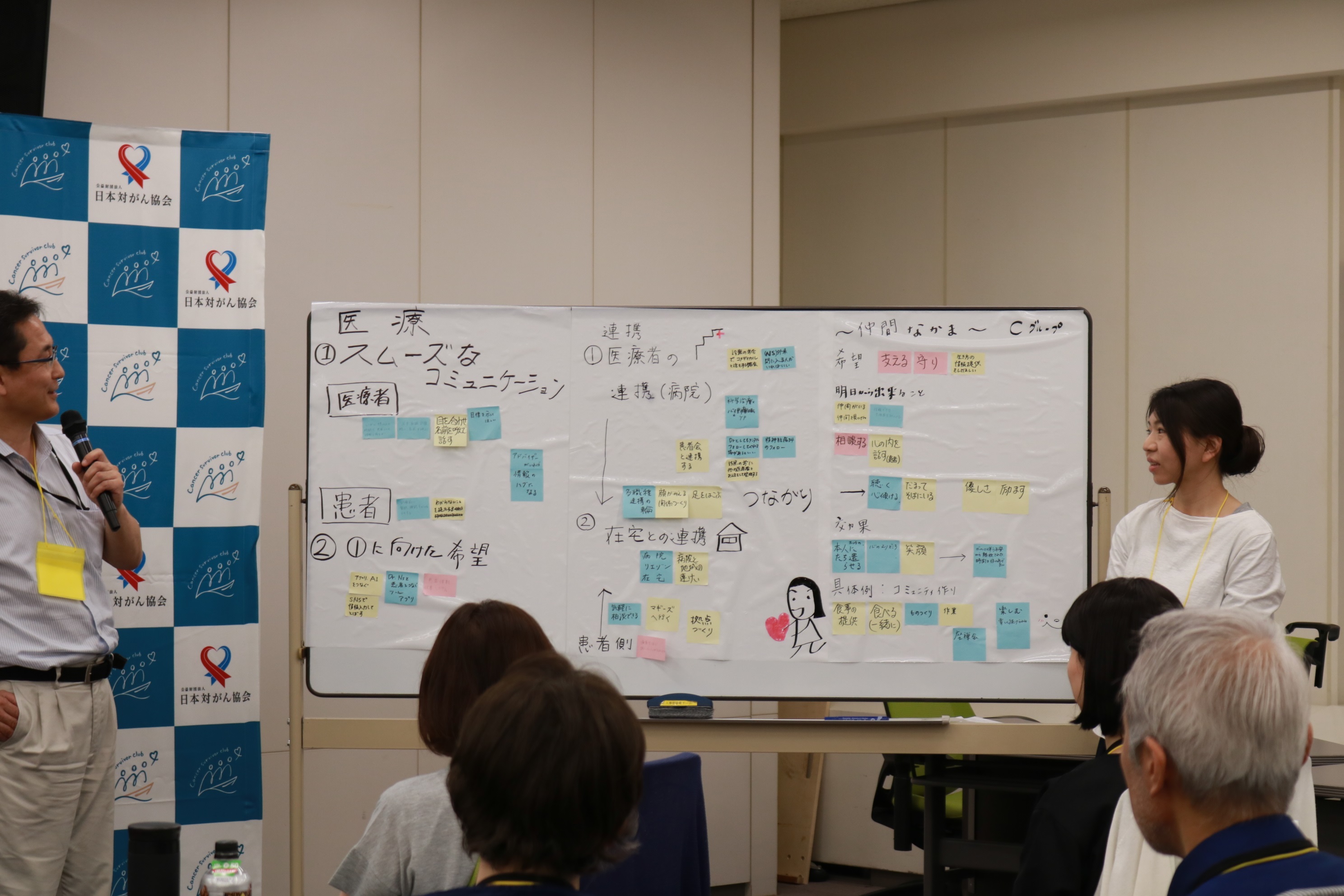 また、別のグループでは個々の参加者らが取り組むべき案を発表。その一人は、サバイバーとしてホテルに勤務している。実際にがん患者支援宿泊プランを始め、さらに、がんになっても早期治療を適切に受けることで普通に勤務できることなどを社内で仲間に啓もうしようと取り組んでいることなどを語った。