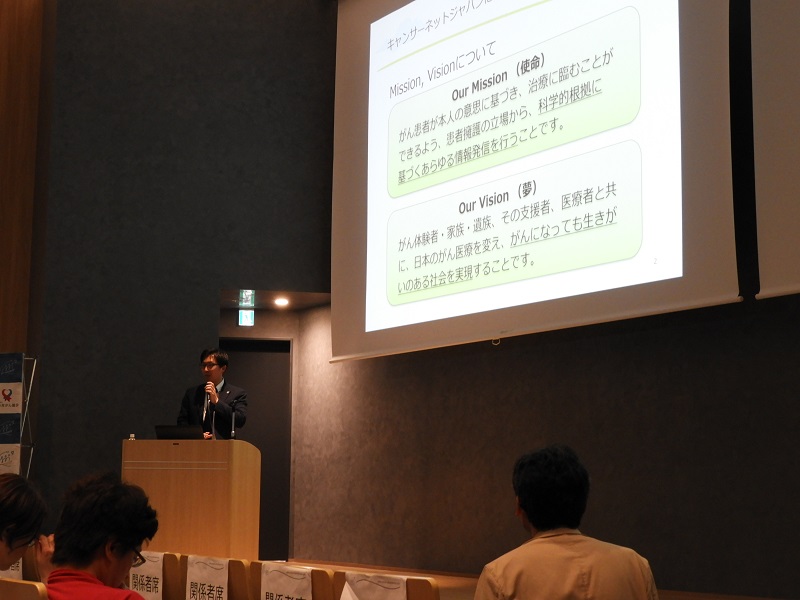 発表のラストは、認定NPO法人キャンサーネットジャパン(CNJ)。事務局長の木原康太さんが登壇した。