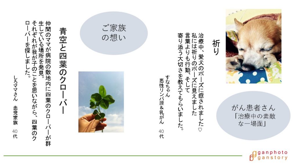 そこで仲間と始めたのが、がんフォト*がんストーリーだ。がん経験者、家族や友人、医療者の投稿型のオンライン写真展。写真や言葉を通じて想いを共有し、勇気をもらったり、反対に誰かに力を与えたりする。 木口さんは「世の中のがんに対するイメージを変えていくきっかけにしたい」と語り、具体的な作品をいくつか見せた。