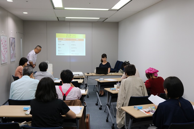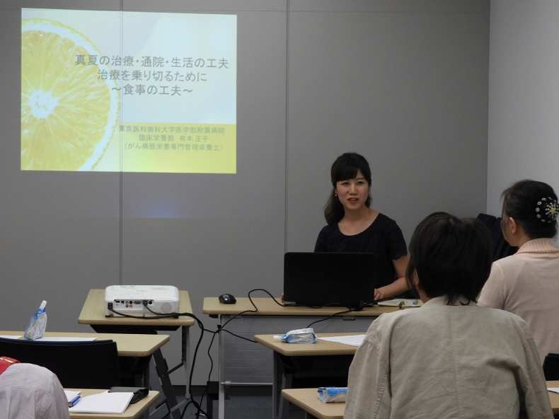 講師は、いずれも東京医科歯科大学医学部附属病院の三宅智医師(緩和ケア科)、本松裕子・緩和ケア認定看護師、有本正子・がん病態栄養専門管理栄養士、の3人。夏のおすすめメニュー、手軽にできる食事や生活の工夫、がんの基本などまで、楽しく学べました。