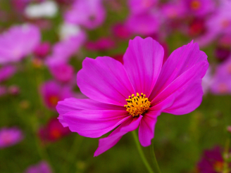 久しぶりに家に帰って庭を見ました。狭い庭だが、一面にコスモスが咲いています。庭に降りて、林立したコスモスの中に入ってみました。可憐なコスモス、いやいや、中には茎の太い、去年はなかった逞しい、Bさんの身長よりももっと高いコスモスが、たくさん咲いていました。