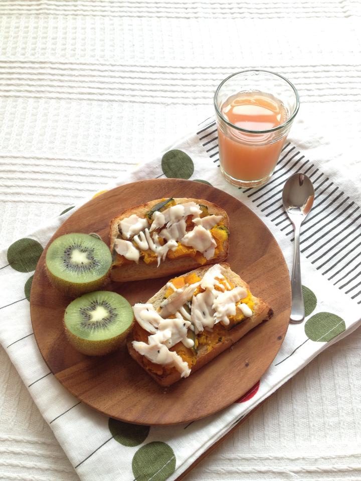自分で作ったパン・マヨネーズ・ハムと、蒸したかぼちゃの朝食。自分で作ると素材がわかるのも利点。