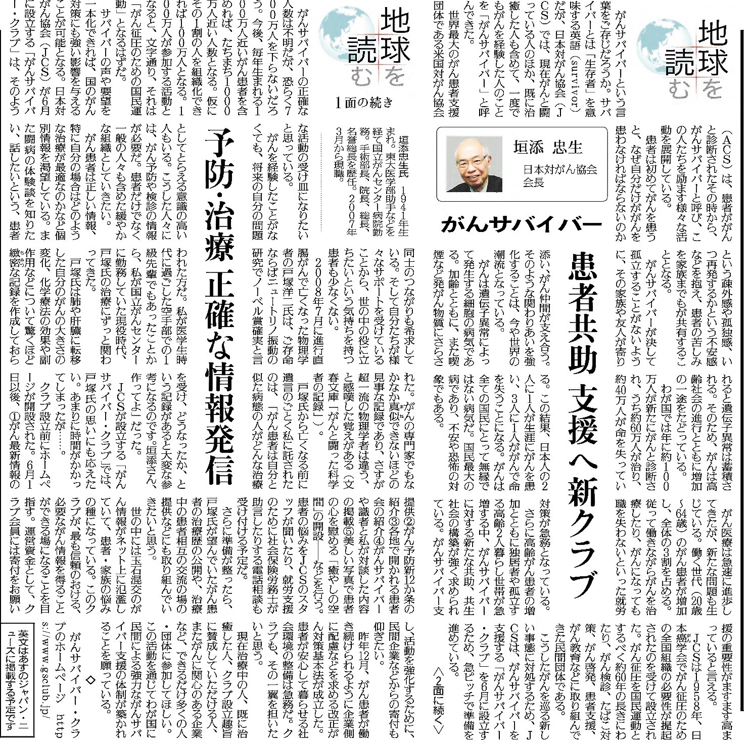 当クラブ運営団体の公益財団法人日本対がん協会の会長垣添忠生が読売新聞朝刊一面「地球を読む」にがんサバイバー・クラブについて書かれた記事が掲載されました。