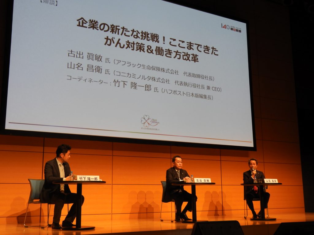 第1部の3番目のセッションは、鼎談「企業の新たな挑戦! ここまできたがん対策&働き方改革」。アフラック生命保険の古出(こいで)眞敏社長、コニカミノルタの山名昌衛社長兼CEOが登壇し、社会に貢献するための企業理念にも触れながら社会の取り組みを披露した。