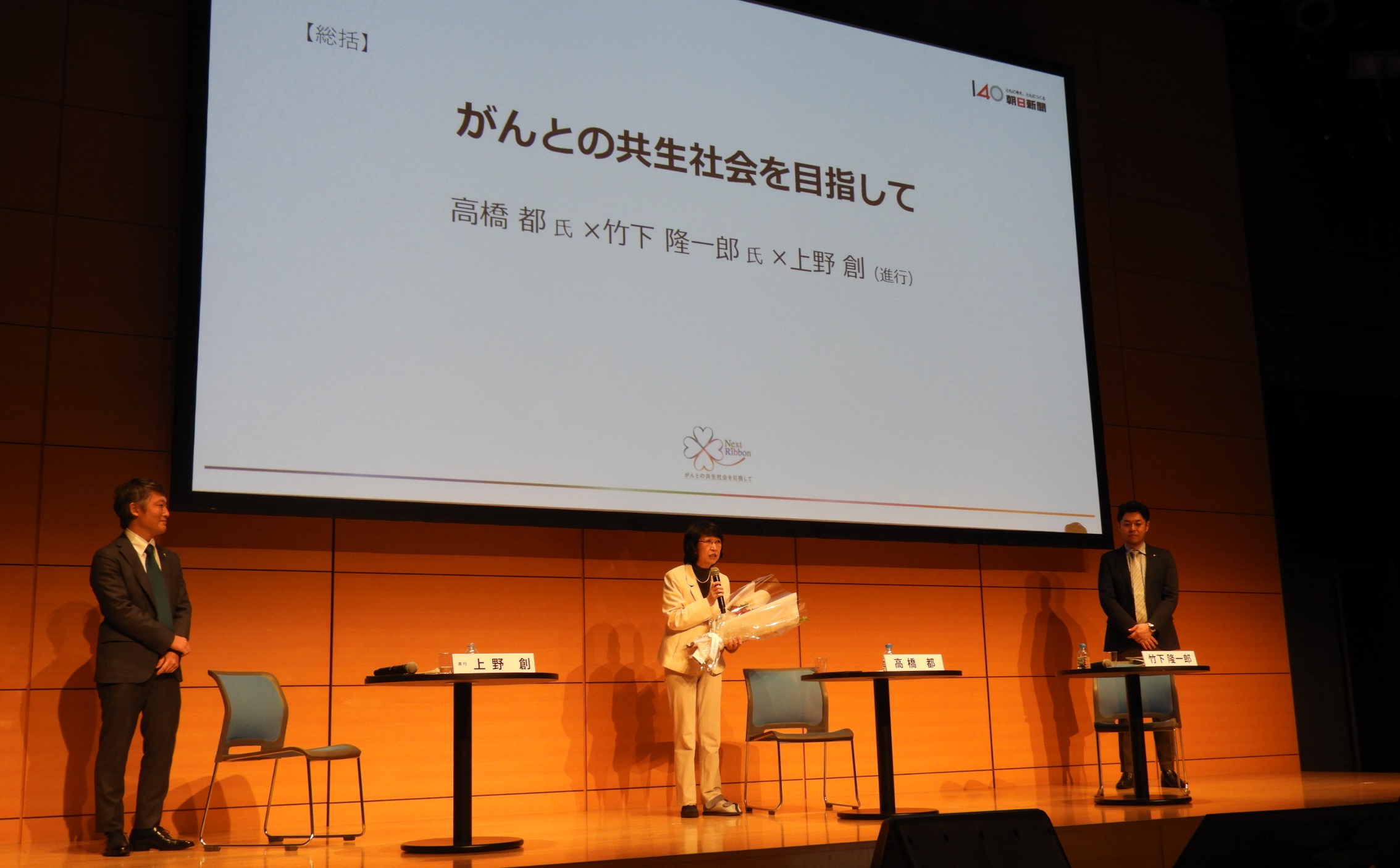 第1部の最後に、国立がん研究センターを退職する高橋都さんに花束が贈られた。