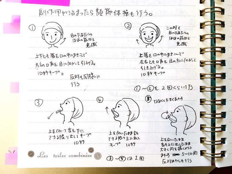 「顔筋体操」も日記に発見。脱毛中のためイラストもケア帽子姿。