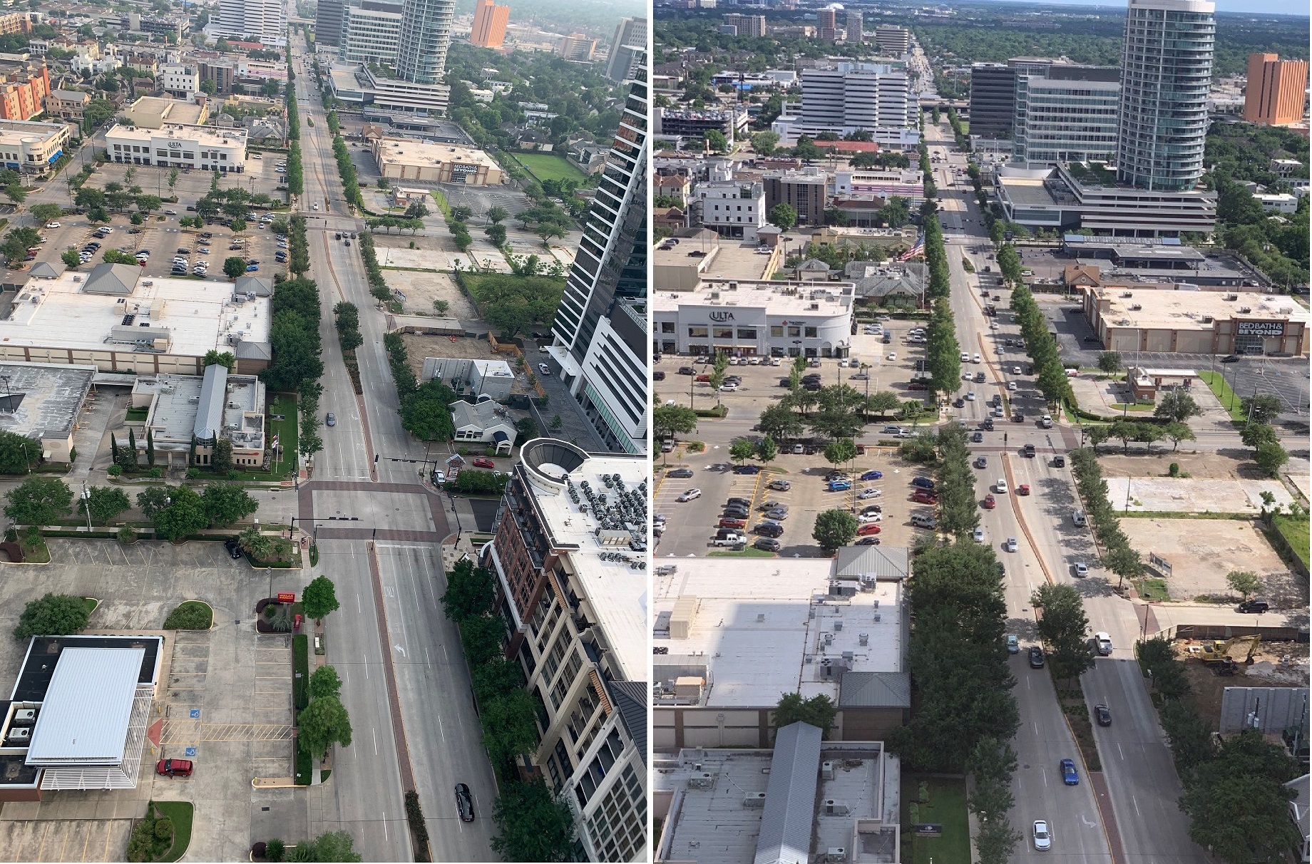 5月26日と4月22日のヒューストンの街並みを比べると、車の数が増えてきのがわかる。