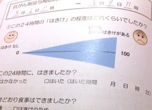 日誌には、特に吐き気は出ず、ほかの吐き気止めは使わず……と記入し、提出。