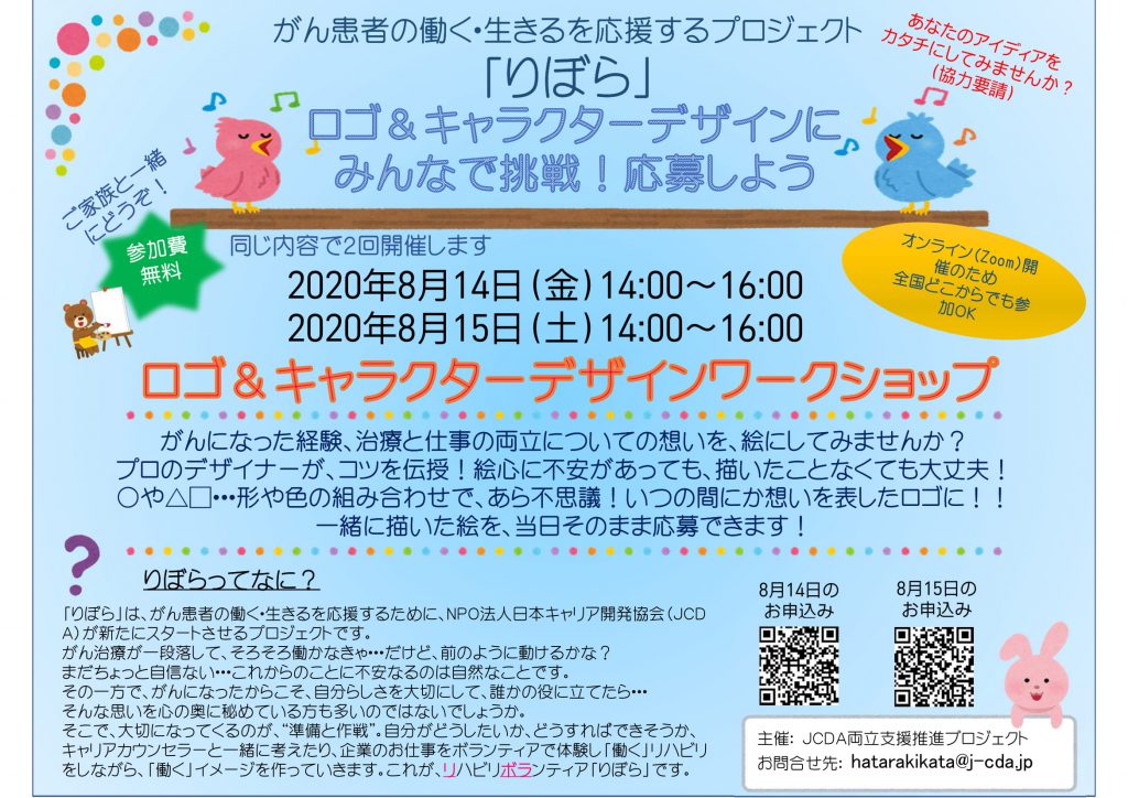 がん患者の働く・生きるを応援するプロジェクト「りぼら」のイメージキャラクターを一緒に作成することを通じ、キャリアカウンセリングを身近なものに感じ、気軽に相談できる社会にしたい! このプロジェクトに関心がある方、がんになった経験を社会に活かしたいというがん患者さんや、がんに関わるすべての方(家族、同僚、友人、医療従事者・などなど・・・・)と一緒に、その想いをカタチにしたい! そんな思いから、ロゴ・イメージキャラクターを公募とし、キャリアカウンセラーと一緒に描く場「ワークショップ」を開催いたします。 ワークショップ主催:NPO法人 日本キャリア開発協会 両立支援推進プロジェクト お問合せ先:hatarakikata@j-cda.jp