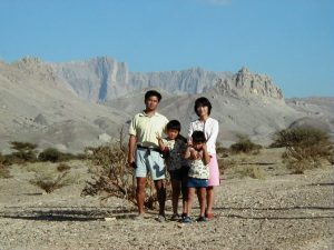 2001年12月、駐在していたドバイから家族4人でオマーンを訪ねた=大弥佳寿子さん提供。
