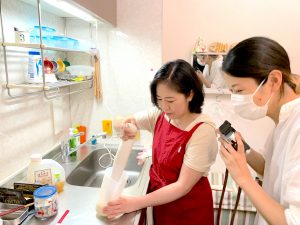取材は、最初にインタビューを行い、次にキッチンへ。ワイワイとした様子は、まるで女子会。これまで受けてきた取材も緊張することはありませんでしたが、今回はさらにリラックスしてしまい、「人工肛門が愉快だった話」や「このところハマっているエクササイズ動画」など、話がいろいろな方向に広がりすぎてしまいました。それでも要点をつかんでちゃんと記事にしてくれた梅﨑さんはスゴイ。
