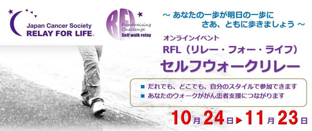 ■主催:公益財団法人 日本対がん協会 / リレー・フォー・ライフ・ジャパン実行委員会 ■実施期間:2020年10月24日(土)~2020年11月23日(月) ■参加費 :ひとり1,000円(がんサバイバーは500円) ■申込期間:2020年10月1日(木)~2020年11月21日(土) ■参加方法:スマホアプリにて登録もしくは主催の地区実行委員会経由で申し込み ■特設ホームページURL https://relayforlife.jp/selfwalk2020