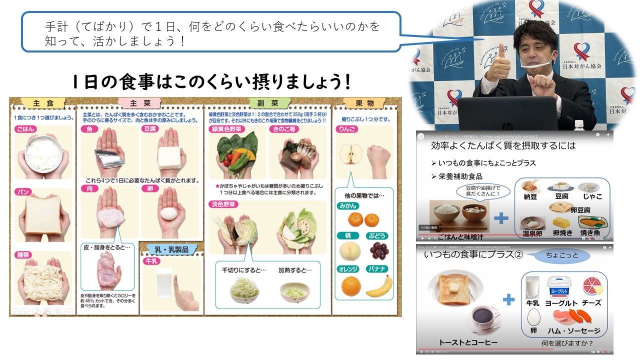 がん患者さんの体重減少には「がん関連性体重減少」と「がん誘発性体重減少」があります。食事量自体が減ったことによるか、代謝異常によって減少したのかということになりますが、どちらか一方ということではなく、シフトしながら体重が減少していきます。また、食事はどのくらい摂ればいいのでしょうか?1日にどの食品をどのくらい摂取したらいいのかを手計(てばかり)を用いて分かりやすく説明します。また、手軽にできる筋肉の測り方(指輪っかテスト)や、代謝異常によって起るがん悪液質への対処方法、栄養療法の重要性を説明します。