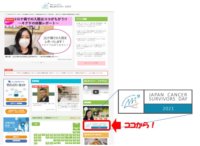 サイトは、がんサバイバー・クラブのトップ画面の右側メニュー「JAPAN CANCER SURVIVORS DAY」バナーをクリックしてください。