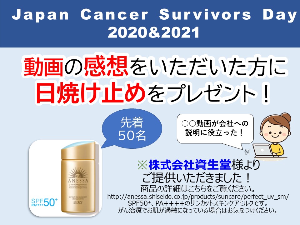 JAPAN CANCER SURVIVORS DAY2021と2020の動画の感想を送っていただいた方、先着50名に日焼け止めをプレゼントいたします!