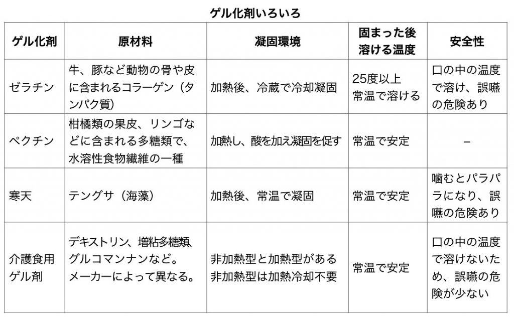 動物の骨や皮に含まれるコラーゲンが原材料のゼラチンは、加熱後に冷蔵庫で冷却する必要があり、完全に固まるまでに、家庭用冷蔵庫で2~3時間かかります。また、口の中の温度で溶けて液状化したり、表面がツルツルしているため、勢いよく喉に滑り込み、誤嚥や窒息を招く危険があります。  天草が原材料の寒天は、加熱後に常温で固まり、安定した状態を保ちますが、嚙むとバラバラ になって口の中でまとまり難いため、これも誤嚥の危険があります。