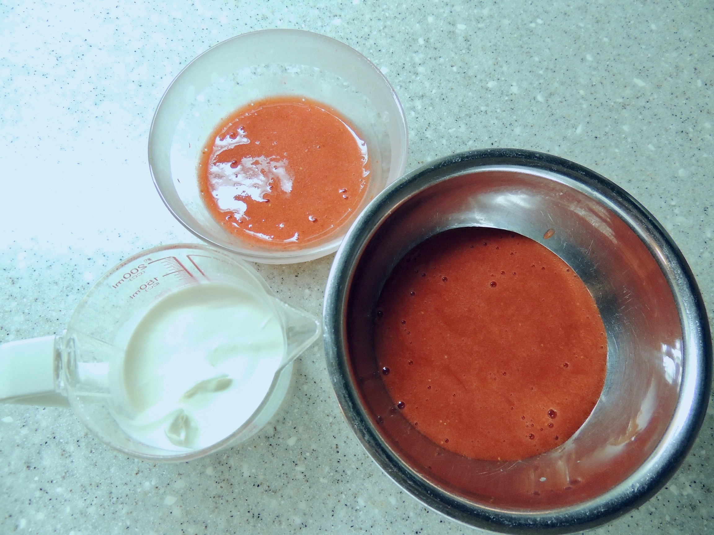 3. 1、レモン汁、砂糖をミキサーにかけ、なめらかなイチゴのピュレを作る。 トッピング用に30gを別皿に取りおく。