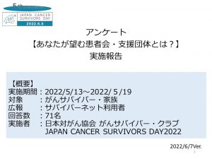 先月、がんサバイバー・ネットのご利用者に「あなたが望む患者会・支援団体とは?」というアンケート調査を実施いたしました。 71名(出展者込)の方から回答をいただき、先日のJAPAN CANCER SURVIVORS DAY2022にて結果発表と、いただいた回答を基にがん研究会有明病院 精神腫瘍科 清水研先生、患者会のNPO法人GISTERS 西舘澄人さん、日本対がん協会がん 相談支援室 がん相談ホットラインの北見知美と、今後どのような活動に活かしていけるかを話し合いました。 アンケート回答結果はこちら 【最新】JCSD2022患者会に希望することアンケート報告書