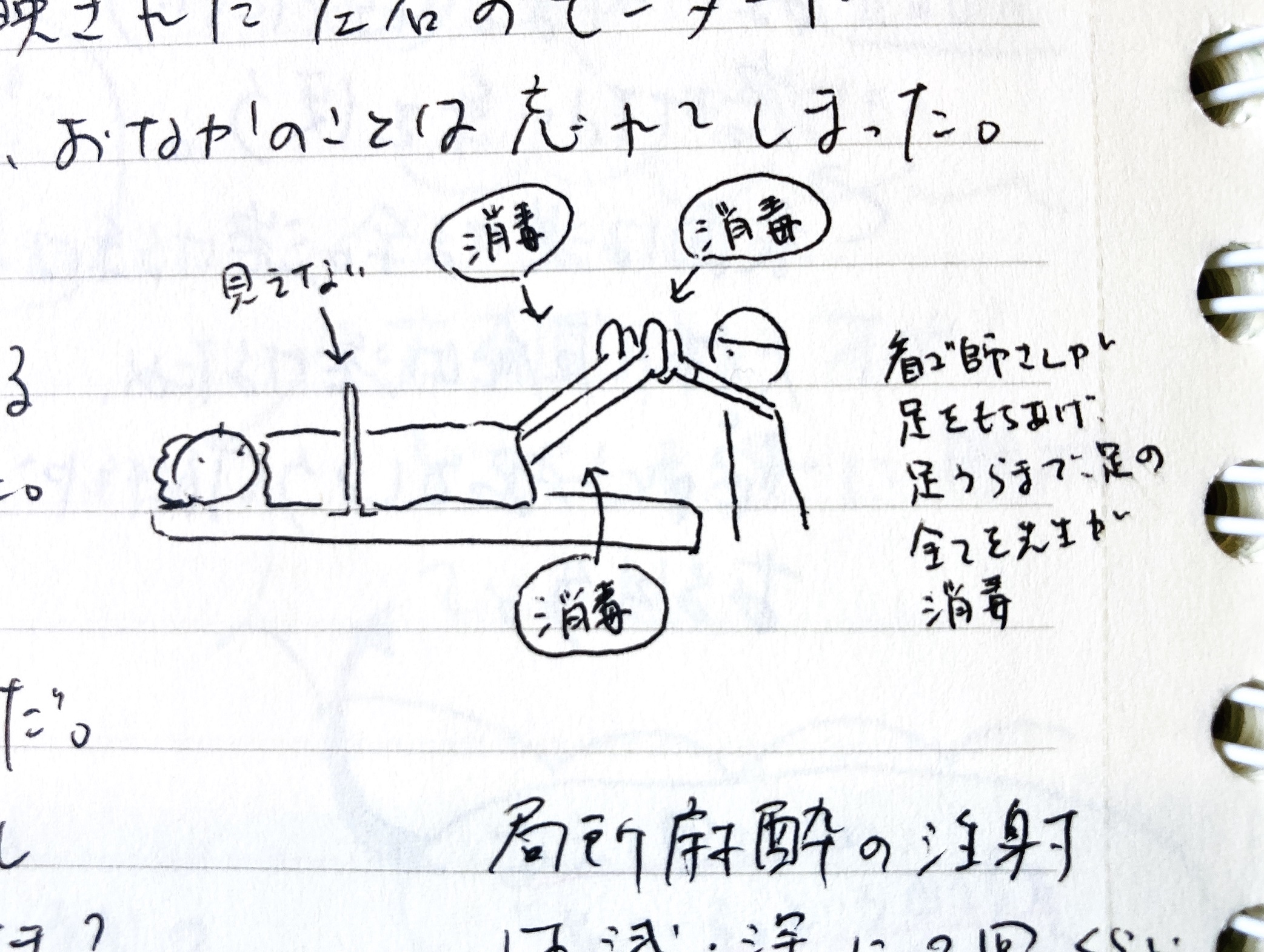 手術するのは太ももだけれど、足を丸ごと消毒するらしい。素早い手つきでイソジンっぽいものが塗りたくられました。