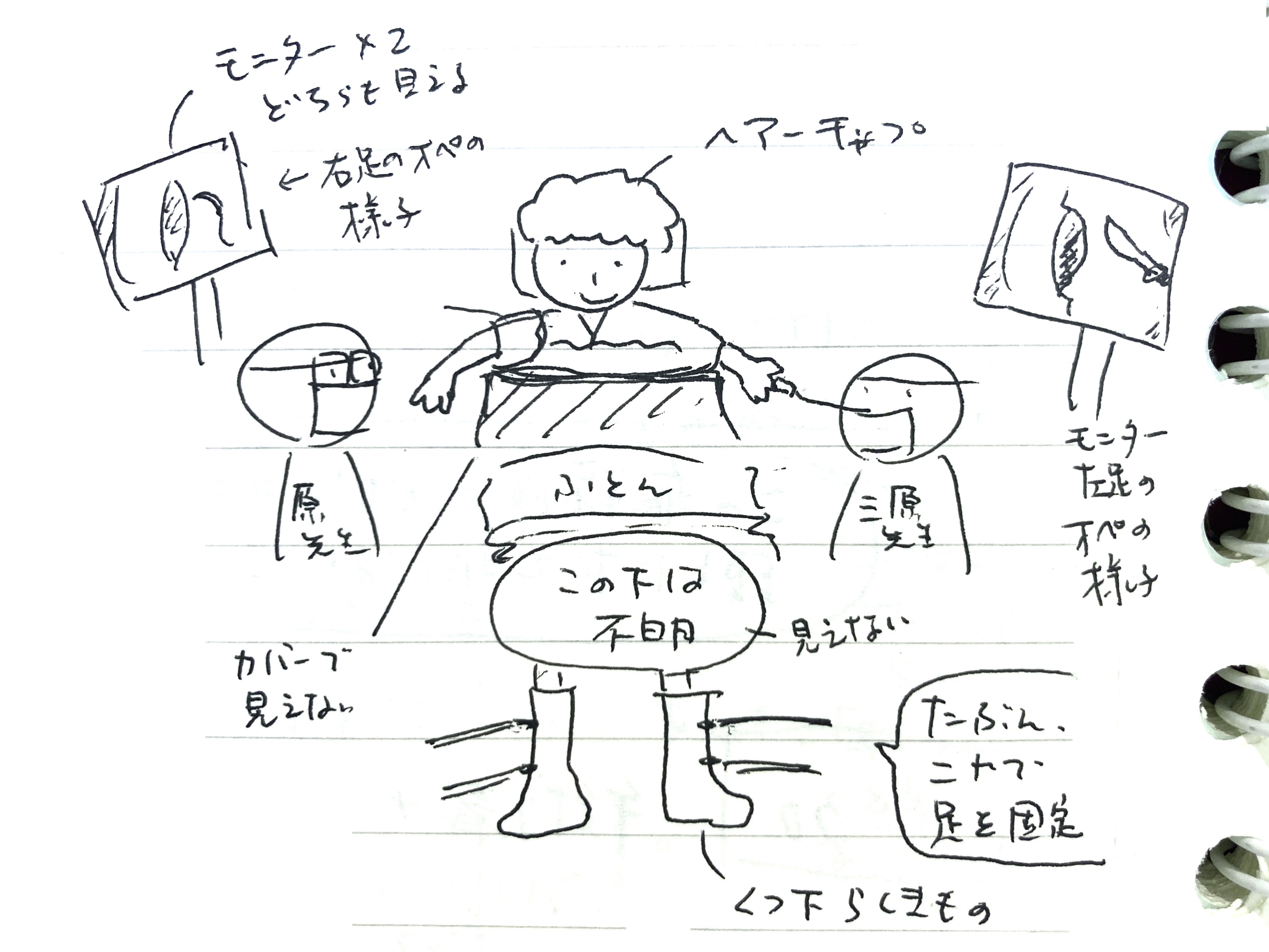すると不意に、足の裏をガッとつかまれる感触がありました。看護師さん(たぶん)が、何やらやろうとしている。