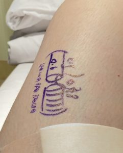 術後は、病棟に戻るなり手術部位を観察。どんなふうになっているのか、とても興味がありました。 するとそこには、マジックで描かれた鳥獣戯画のようなタッチの絵が……!? 面白いおみやげをもらいました(笑)。