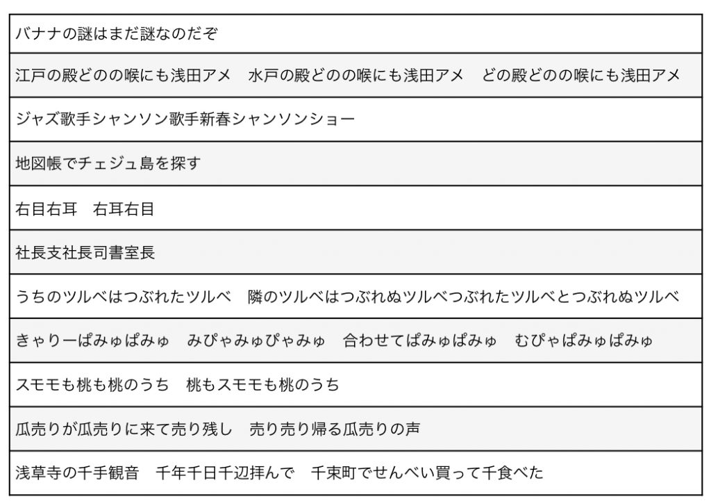 嚥下体操のほかに口腔を鍛えるトレーニングとして、早口言葉があります。遊び感覚で楽しみながらできます。ご家族と一緒にやると盛り上がりますよ。 いくつかご紹介します。