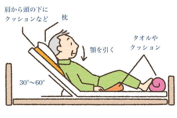 1. 基本的な姿勢のポイントは座って食べるときと同じです。 リクライニング機能を使って上半身を起こし、枕やクッションを使って頭と上半身を安定させ、顎を引きます。 体を起こすことで、食べ物を喉へスムーズに送り込みやすくなります。
