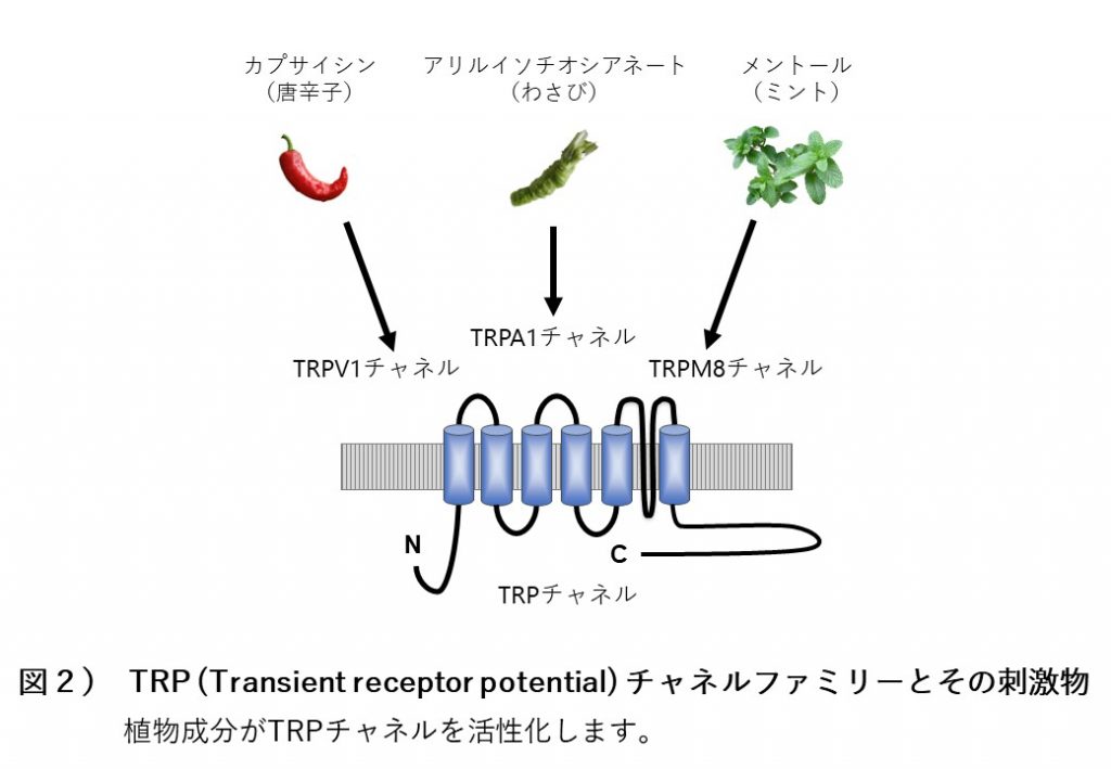 TRPチャネルには多種多様の種類があり、その多くは植物成分により活性化されます。2021年のノーベル医学・生理学賞はこのTRPチャネル研究に与えられました。例えばトウガラシの成分であるカプサイシンはTRPチャネルのひとつであるTRPV1チャネルを、ワサビやマスタードはTRPA1チャネルを活性化し辛さを感じます。また、冷え冷えとした感覚を生むミントはTRPM8チャネルを活性化し身体を冷んやりとさせます(図2)。私たちは生姜や山椒が口に入るとTRPV1、TRPA1チャネルを介して辛さやしびれを感じますが、大建中湯を構成する生姜、山椒の成分ももちろんこれらのチャネルを活性化します。つまり大建中湯は、腸などの消化器に発現しているTRPA1やTRPV1チャネルを活性化することで温痛覚や触覚などに影響を与え、腹部の冷えや膨満感を軽減していると考えられているのです。