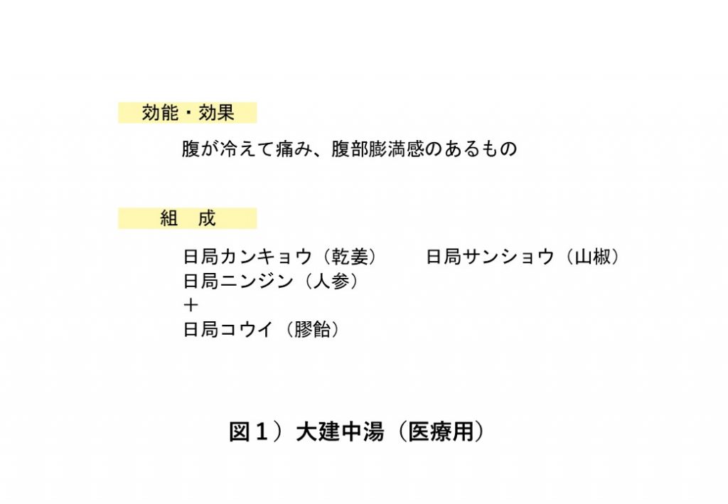 大建中湯はたくさんある漢方薬の中でもかなりシンプルであり、乾姜(蒸した生姜を乾燥させたもの)、山椒、人参という3つの生薬でできており、飲みやすいように大量の飴(膠飴)が含まれています(図1)。