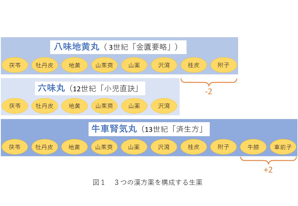 前述の牛車腎気丸(10種の生薬で構成)は13世紀に中国で誕生し(「済生方(さいせいほう)」に記載)、下肢のしびれや痛みの症状緩和に用いられています。牛車腎気丸は八味地黄丸(8種で構成)に牛膝と車前子を足して生まれたものです。八味地黄丸は3世紀の書物「金匱要略(きんきようりゃく)」にその名前があり、昔も今もしびれ、腰痛や“腎虚”と呼ばれる尿失禁など下肢の症状に用いられています。一方、八味地黄丸から桂皮と附子を抜いたものが六味丸(6種で構成)で、これは12世紀に中国で生まれました(「小児直訣(しょうにちょっけつ)」に記載)(図1)。当初、六味丸は小児用として作られましたが、今は年齢にかかわらず下肢のしびれや脱力などに用いられています。3世紀に生まれた八味地黄丸に2種類の生薬を足し算・引き算することで、対応する症状を少しずつ変え、選択肢を増やしているこの手法、なかなか興味深いですね。