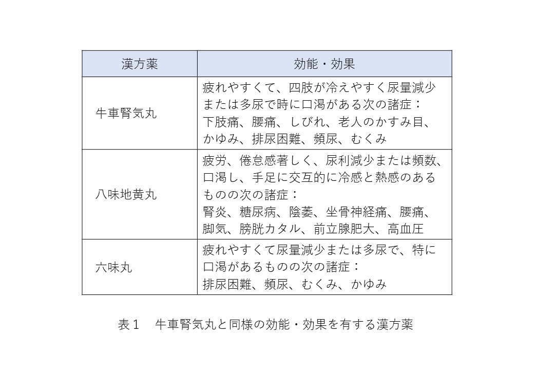 また、牛車腎気丸と同じような効果・効能を示す漢方薬には八味地黄丸(はちみじおうがん)、六味丸(ろくみがん)があります(図1)。痛みの種類や痛みの程度によって、また自分の体質に合っているかどうかで服用する漢方薬を選択することも大切かと思われます。