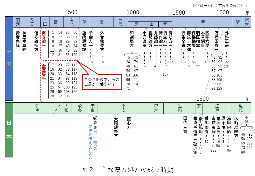 さて、図2を説明します。これは現在使用されている148種類の医療用漢方製剤のオリジン(源流)を示したもので、数字は現在の主な医療用漢方製剤の製品番号です。漢方薬のオリジナルとなる生薬を用いて作られた製剤は、中国で2〜3世紀に著書としてまとめられた「傷寒論(しょうかんろん)」および「金匱要略(きんきようりゃく)」にその源流を見ることができます。図2をよく見ていただくと、2〜3世紀に作られた生薬製剤が実は現在の医療用漢方製剤で一番多く活用されていることがわかります。その後、中国そして日本においても、時代時代でその時の「新薬」が創られてきました。たとえば、食欲不振によく用いられている六君子湯(43番)は16世紀の中国の書物「万病回春(まんびょうかいしゅん)」に初めて登場します。また、日本で作られて現在も使われている、いわゆる「和製漢方薬」も存在することがわかります。一方、現在使われている漢方薬の中には出典不明というものもあるんですね。おそらく図2に示してあるもの以外にもたくさんの生薬製剤が中国や日本で作られてきたのでしょうが、あまり効かないものや安全性に問題があったものは淘汰されたんだと思われます。つまり、今も残っている漢方製剤は、いわば生薬製剤のエリートと言えるかもしれません。古(いにしえ)から歴史を経て経験に基づいて生薬製剤を「ああでもない、こうでもない」と試行錯誤して創ってこられた先達に思いを馳せながら、現在まで脈々と続いている漢方薬を私たちは感謝して使っていきましょう。