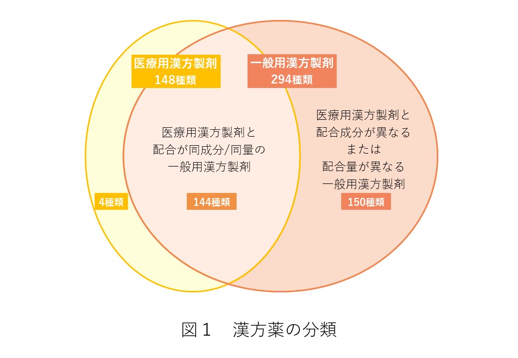 漢方薬は、生薬を細かく刻んで調合し煎じ薬としてお湯で煮出すなどして服用されてきました(もちろん今もその方法で服用可能で、漢方専門薬局ではそれらの生薬を売っています)が、漢方薬の製造工程がやや煩雑であり、安定した品質のものを常には供給しにくいということから、エキス剤(漢方製剤)が普及してきました。エキス剤は顆粒、カプセル、粉剤、錠剤の形で販売されています。また、日本では1967年(昭和42年)より漢方製剤に健康保険が適用されるようになり、現在では148種の漢方製剤が健康保険でカバーされています。すなわち、お医者さんが処方してくれる漢方薬、医療用漢方製剤のことです。その一方で、薬局やドラッグストアで市販されている一般用漢方製剤も294種類あります(図1)。医療用漢方製剤と全く同じ内容で薬局等で購入できる一般用漢方製剤も144種類あります(ほとんど買えますね!)。