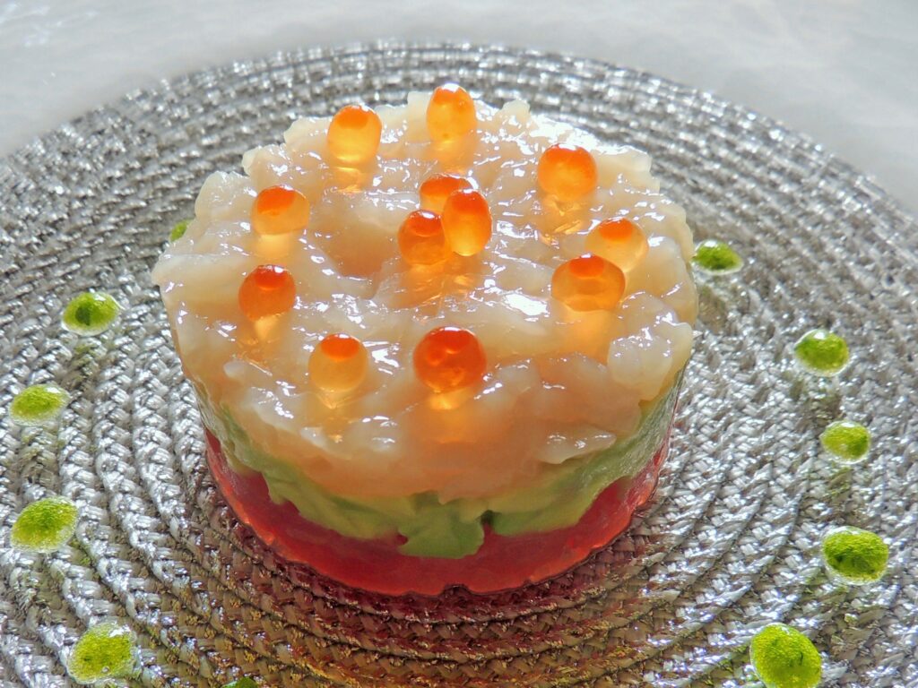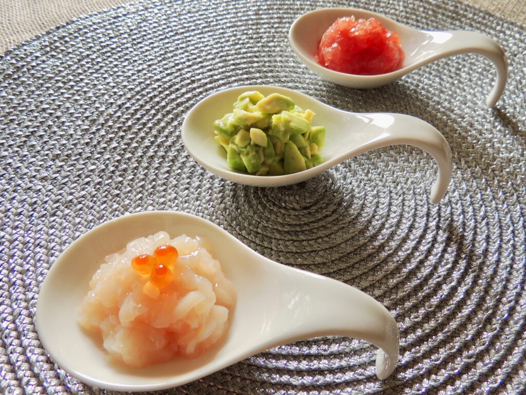 | 材料名 | 分量 | 1 | ほたて貝 | 30g | 2 | マグロの赤身 | 30g | 3 | アボカド(熟したもの) | 30g | 4 | イクラ | 適宜(無くても可) | 5 | レモン汁 | 少々 | 6 | フレッシュハーブ(イタリアンパセリ、ディル、セルフィーユなど好みで) | 適量 |