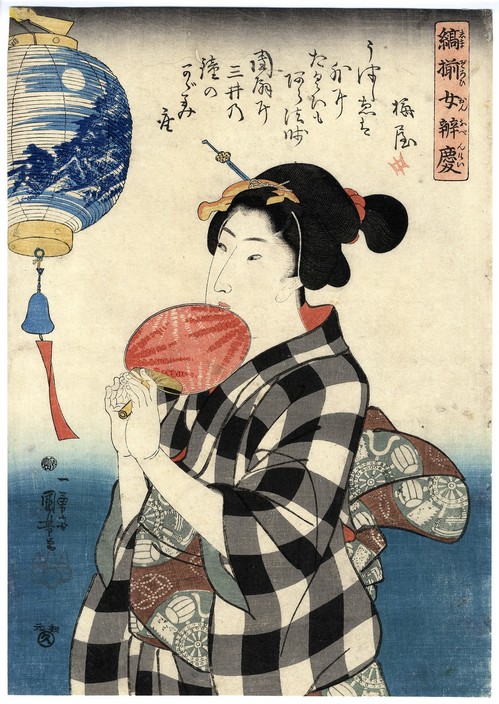 国芳作「縞揃女弁慶」は風鈴、団扇、弁慶格子(縦横同じ太さで幅広の格子柄)の着物の取り合わせが夏らしい1枚です。風鈴そのものが体を冷やしてくれるわけではありませんが、風鈴が鳴っている=風がそよいでいる=涼しいという体験から、風鈴が鳴る=涼しいの条件反射で実際に皮膚温が下がるのだそうです。氷を見ると涼しく感じるのも、氷=冷たいという誰もがもつ体験からの条件反射なんですね。