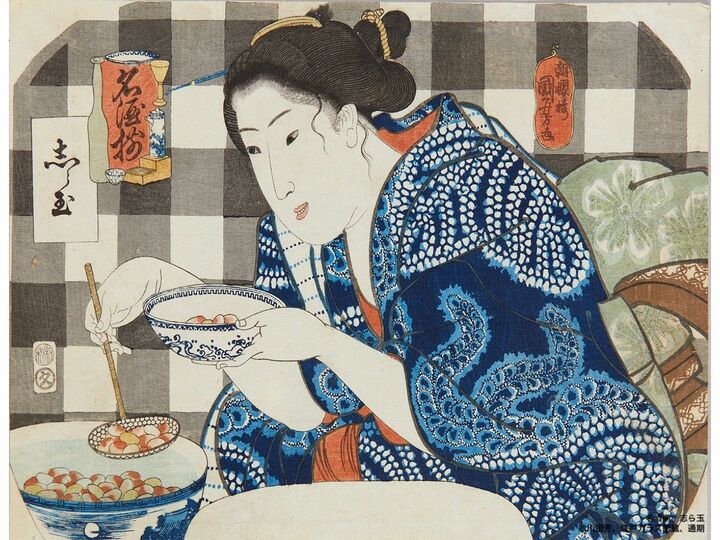 こちらも国芳作の団扇絵「名手揃 志ら玉」で、志ら玉はお酒の名前です。青い染付の鉢に張った冷や水に紅白の白玉が浮かんでいます。砂糖を加えた冷や水の冷たさとつるっとした食感の白玉は夏に大人気のおやつで、きな粉をかけて食べたりもしたそうです。嬉しそうにすくう女性の浴衣の藍色がなんとも涼しげです。