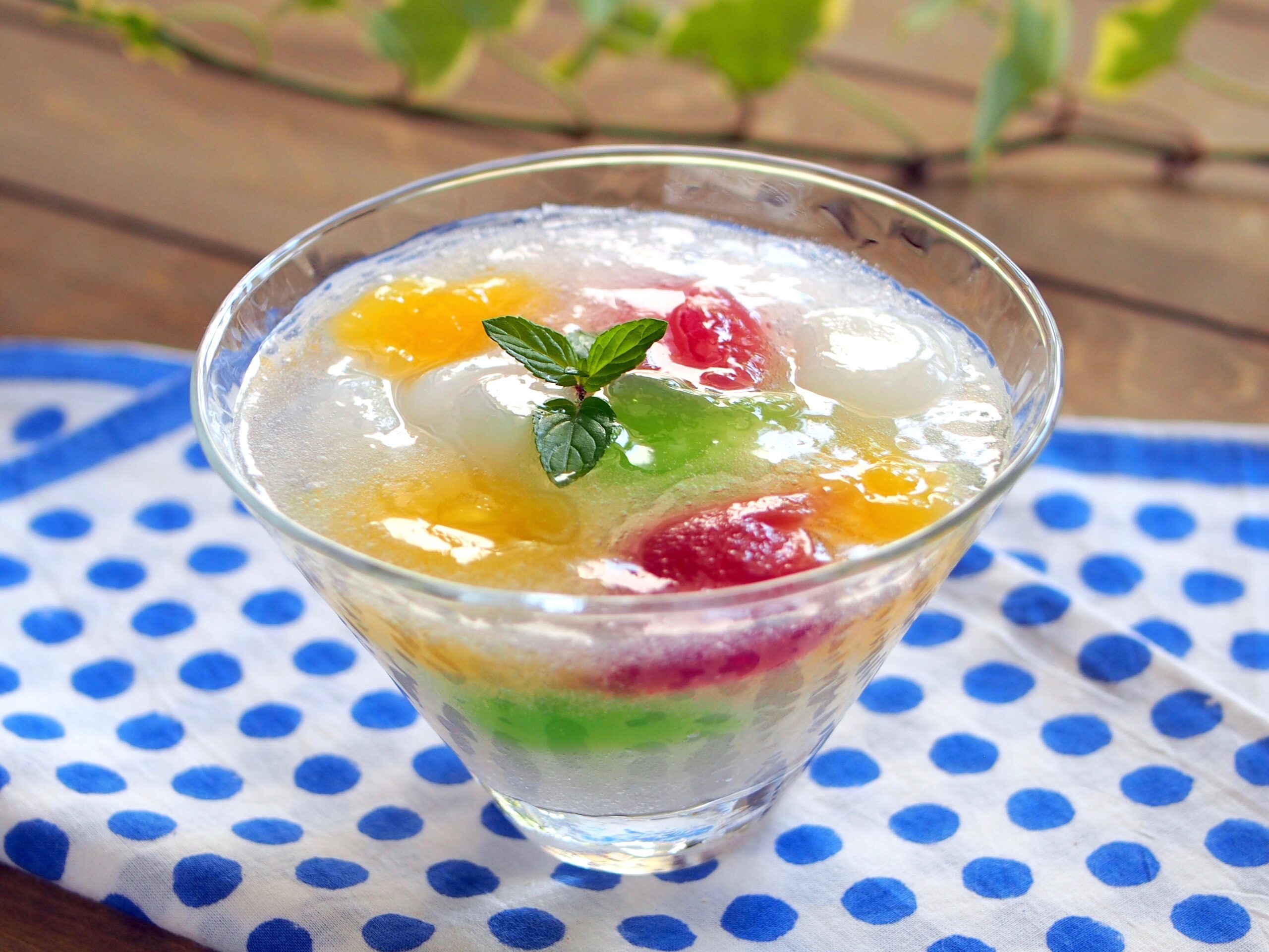 | 2に1のゼリーを混ぜ、器に盛りミントの葉を添える。 |