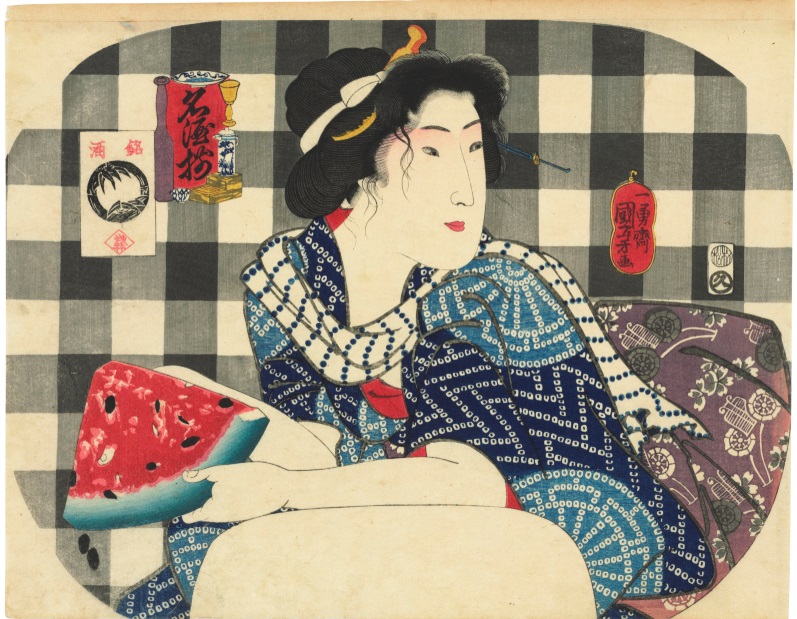 この絵は歌川国芳作の団扇絵「名酒揃」の一枚です。おなじみの形に切ったスイカを持つ女性の髪がほつれています。手ぬぐいで汗を拭き拭き、「あ〜暑いったらないね〜」なんて言いながら、せっせとタネを取っているのでしょうか。指が突き抜けてしまているところにおかしみを感じます。