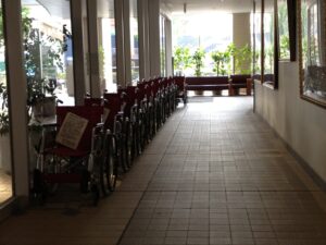 入院中に記録の延長で撮ったスマホ写真『ズラリ車椅子』。