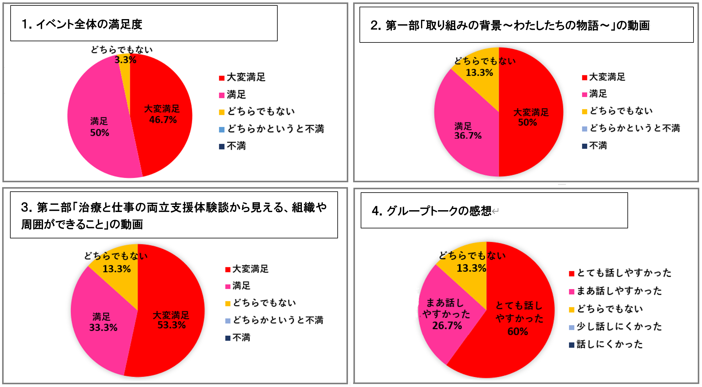 ≪全体≫回答一部抜粋 ・今までの自身の思い込みが間違っていることに気づいた。 ・自らの復帰時の困難やサポートについて語り、他の方の体験を伺うことができた。 ・今、まさに自分が抱えているモヤモヤを、グループワークで話すことができたので大変満足。 ・がんになった時の思いを共有できたように思う。同じような悩みを持ち続けるよりも、このような場所があれば解き放てるのだと感じました。 ・今年キャリアコンサルタントの資格を取得し、仕事と治療の両立支援の場に立つことを目指しています。しかし、どのように進んでいけば、そこにたどり着けるのか分からずにいます。そんな中、このイベントに参加させていただきました。この様な学びの場があり、本当に嬉しかったです。