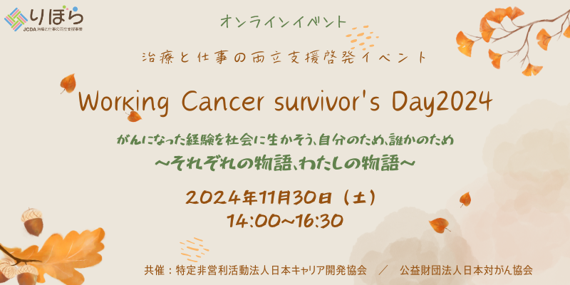 | 13:30 | オープニング 主催者挨拶 公益財団法人日対がん協会 常務理事 石田 一郎 特定非営利活動法人日本キャリア開発協会 理事長 大原良夫 | 13:45 | 第一部 取り組みの背景~わたしたちの物語~ ご登壇: 伊藤忠商事株式会社 人事・総務部キャリアカウンセリング室 松本直樹さん 伊藤忠商事株式会社 人事・総務部キャリアカウンセリング室 庄本恭子さん サッポロビール株式会社 広報部ビール文化コミュニケーショングループ 兼 人事総務部 プランニング・ディレクター 村本高史さん モデレーター:キャリア・デベロップメント・アドバイザー、JCDA認定インストラクター、国家資格キャリアコンサルタント 原博子さん | 15:30 | 第二部 治療と仕事の両立支援体験談から見える、組織や周囲ができること ご登壇:村本高史さん モデレーター:キャリア・デベロップメント・アドバイザー、国家資格キャリアコンサルタント 室田智美さん | 16:30 | クロージング 公益財団法人日本対がん協会、特定非営利活動法人日本キャリア開発協会の取り組み紹介 |
