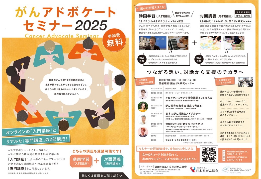 このたび、公益財団法人日本対がん協会は「がんアドボケートセミナー2025」を開催する運びとなりました。