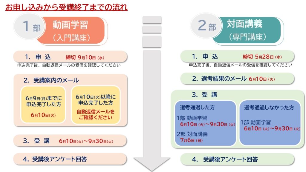 ●1部と2部は 申込締切日や受講案内時期、受講期間などが異なります。下記の画像も併せて、ご自身にあった内容をご確認の上お申し込みください。