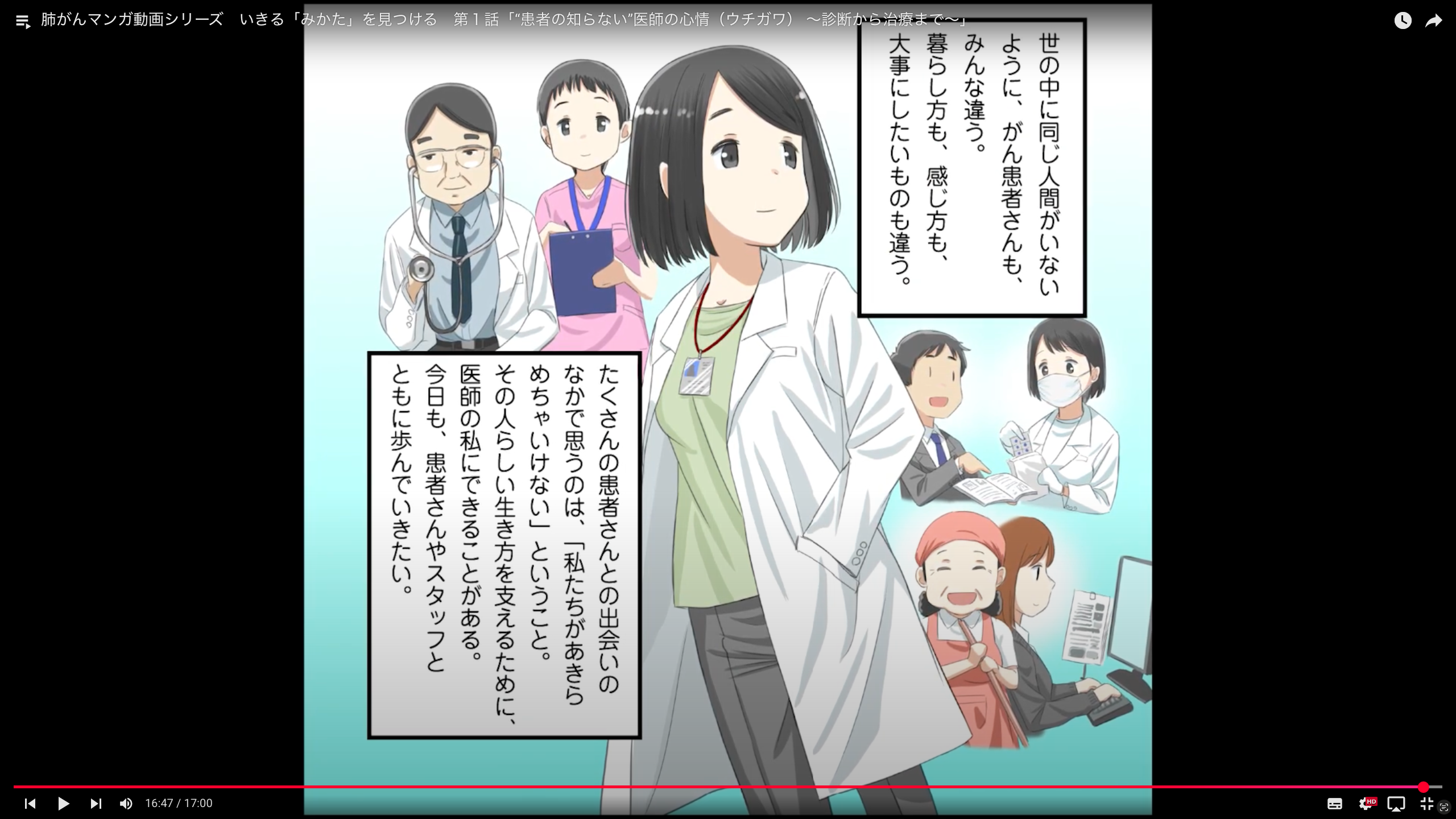 患者に同じ人がいないように、医療者もそれぞれに違います。みんなが同じ想いでいるわけではありません(当たり前だ)。それでも、患者を支え、共に歩もうとしている医療者は確実にいる(しかもたくさんいる!)のだと、マンガ動画に関わる中で改めて感じました。