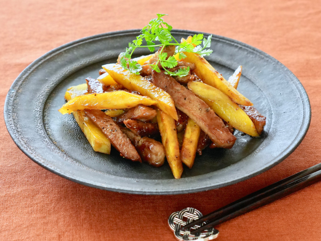 秋はさつま芋の甘みが増して、いっそう美味しくなる季節です。牛肉と甘いさつま芋にオイスターだれがからみ、仕上げのバターの風味が食欲をそそる、食べ応えのあるおかずになります。
