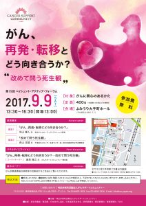 日程 : 2017年9月9日(土)13時30分~16時30分(13時開場) 場所 : よみうり大手町ホール(東京都千代田区大手町1-7-1) 対象 : がん患者さんと彼らのご家族、テーマに関心のある方ならどなたでも 定員 : 400名 参加費: 無料 申込み: こちらのHPをご覧ください 主催 : 特定非営利活動法人がんサポートコミュニティー
