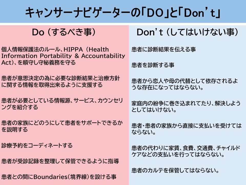 週2回、朝から夕方までの講義が、全部で6日間。キャンサーナビゲーターの心得、がんの基礎知識、がんが患者の精神に与える影響、低所得者へのケア……。「するべきこと」「してはいけないこと」は表の通りだ。